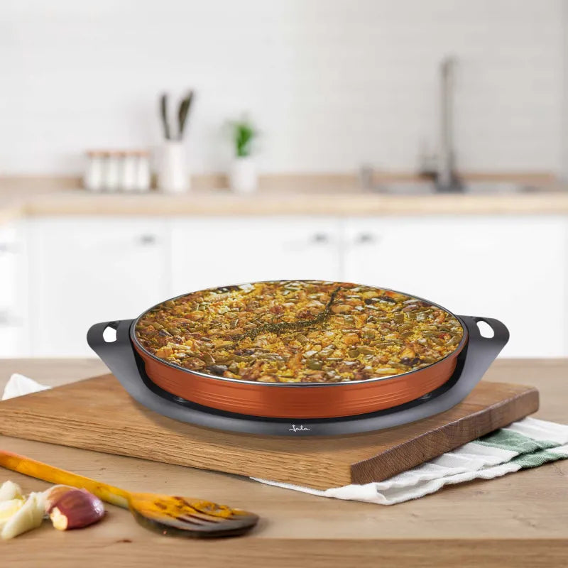 Equipada con un termostato regulable y extraíble, puedes ajustar la temperatura según lo que estés cocinando, y luego retirar el cable para llevar la paellera directamente a la mesa con total seguridad.