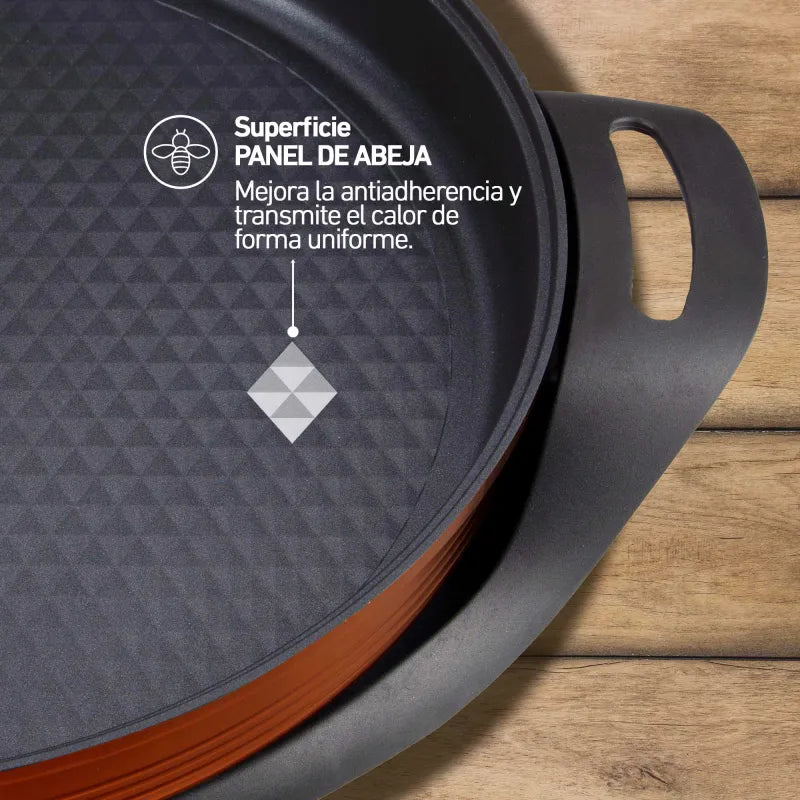 Su potencia de 2.000 W asegura un calentamiento rápido y uniforme, mientras que su superficie tipo “panel de abeja” mejora la antiadherencia y distribuye el calor de forma homogénea.